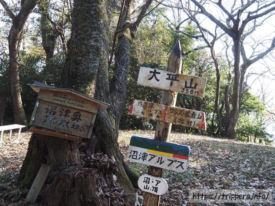 7座目の大平山に到着しました。標高はさっきより少し低くなって356mです。これで沼津アルプスを全山縦走し終えました。