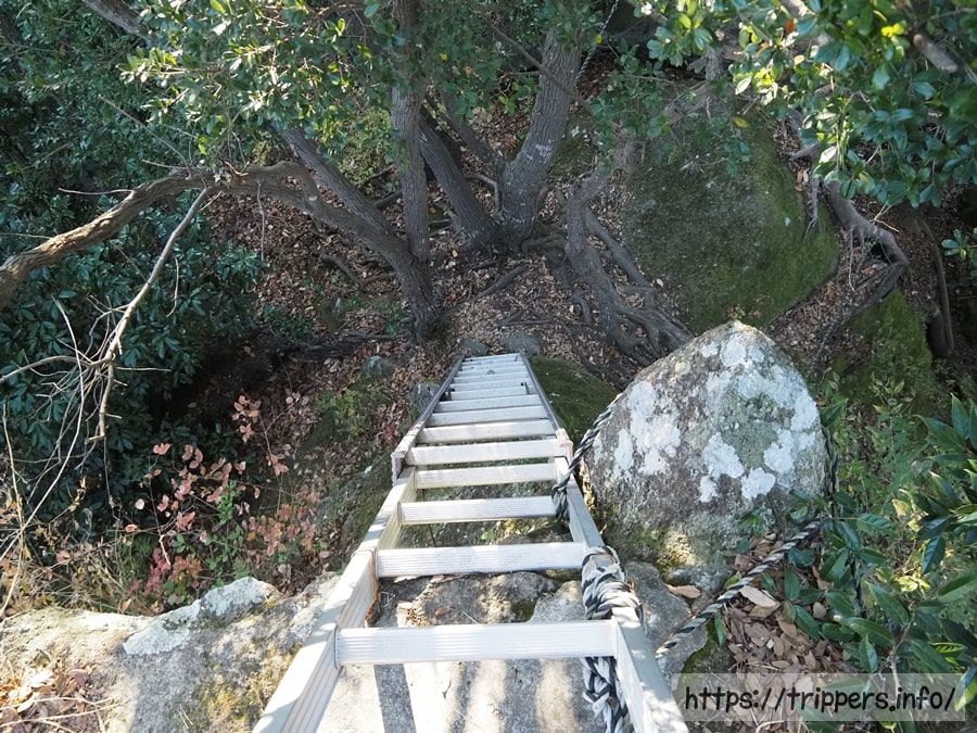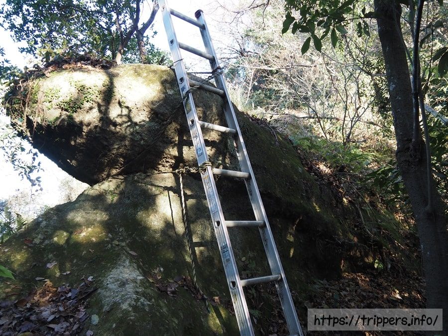 岩に立てかけられたような長い梯子が待っていました。虎ロープだけで固定されているようで、乱暴に扱うのは危険です。慎重に登ります。登り切った先の足場は狭く、高度感がありました。