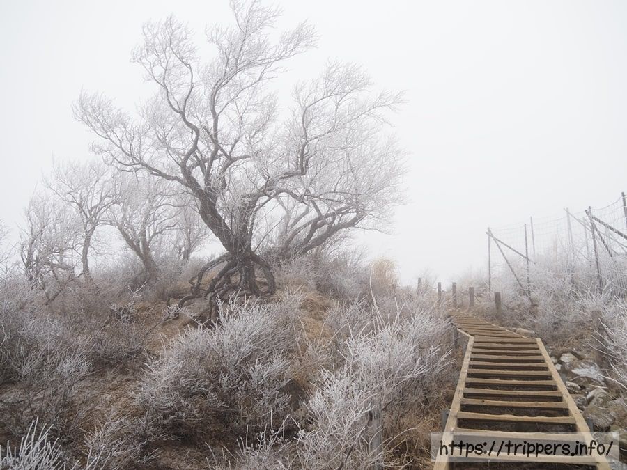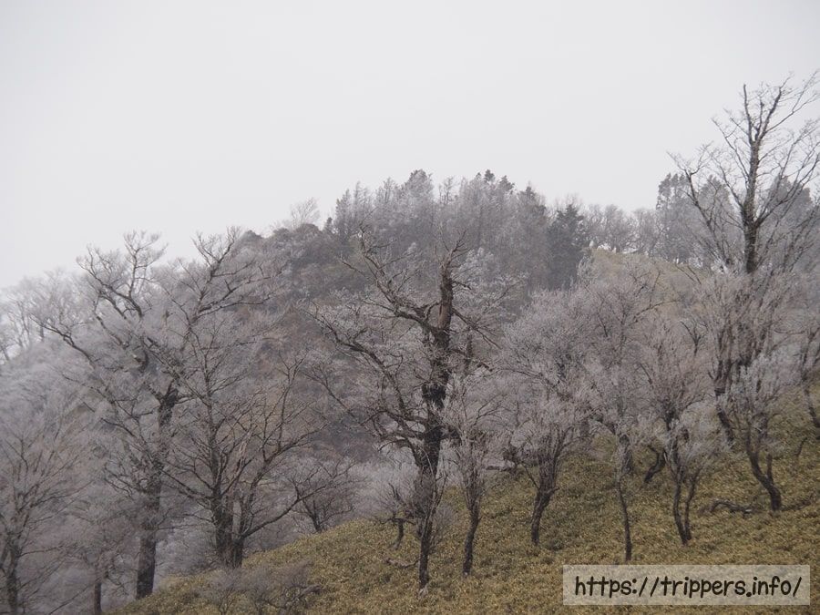 空が白いガスでなく、青空だったらどれだけ霧氷が映えただろうか。嗚呼、天変地異のごとく奇跡でも起きないかと、ぼやいてみます。