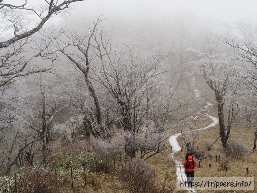 塔ノ岳直下まで来ると、できたてほやほやの霧氷が見られるようになってきました。登山者の数は少ないながらも、登ってくる人はいます。天気はどんどん荒れ模様になっていきますが、翌朝は晴天の予報なので、今日稜線上の山小屋に宿泊した人は絶景に出逢えそうな予感です。