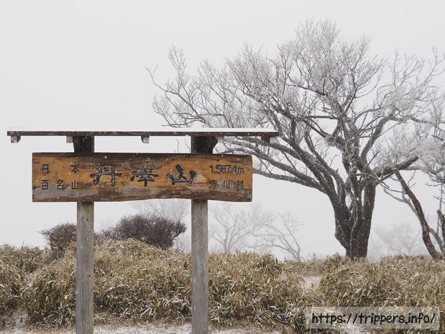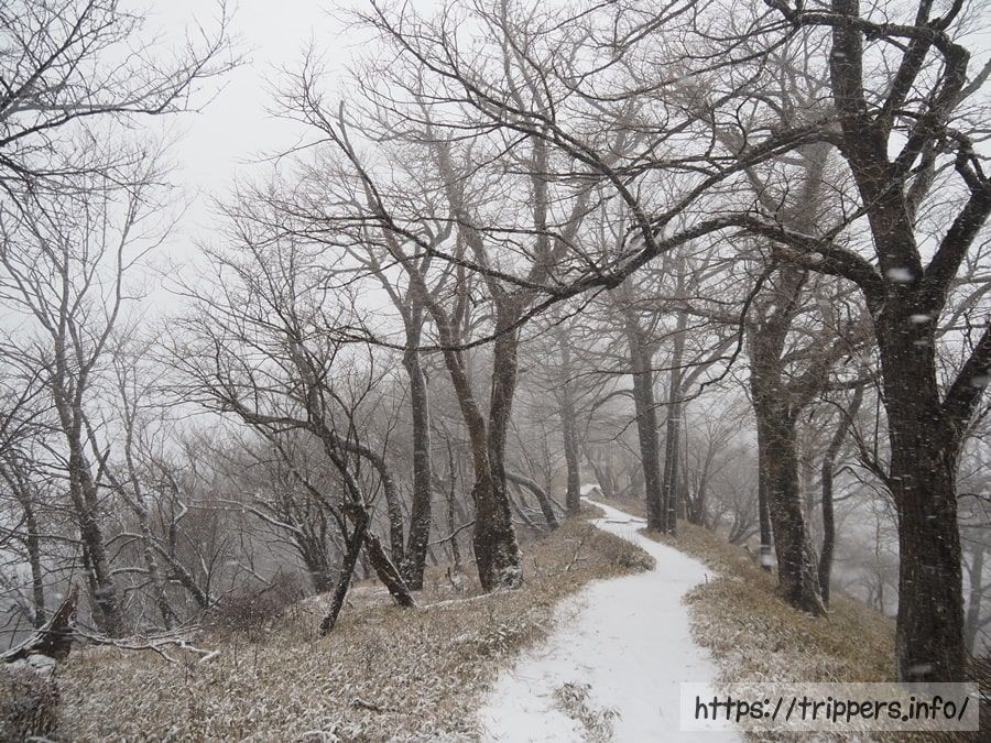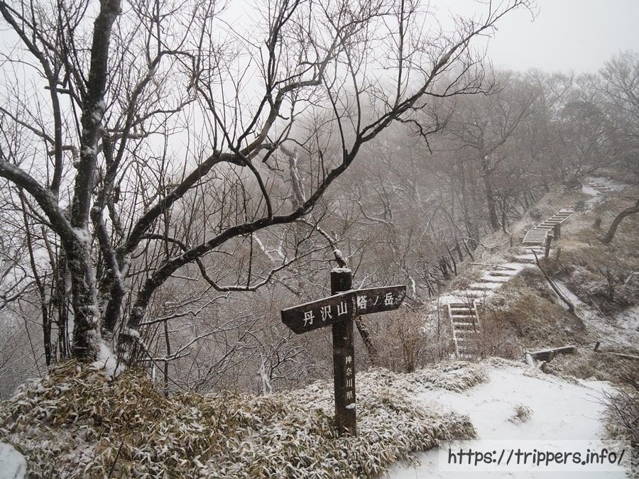 丹沢山に到着したら朝食休憩です。雪降る登山は生まれて初めてになります。年始の登り始めは塔ノ岳と丹沢山になりました。横から雪が舞いだす中、傘をさして塔ノ岳へ引き返すことにします。