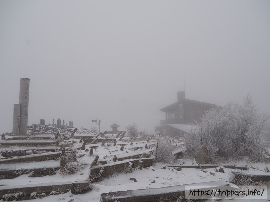 塔ノ岳の山頂に到着しました。霧氷が育つまでまだ時間がかかりそうです。表尾根は既にガスって視界はありません。極寒の中、状況が変化するまで尊仏山荘の中で待機するか、下山するか迷いました。