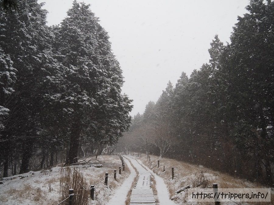 木道が雪で真っ白です。雪でスリップしないように無意識にフラットフィッティングで歩いていました。以前、山登りで疲れない歩き方だと聞いたことありました。普段はフラットフィッティング(フラット歩行)でなくても疲れないので、歩き方を気にすることはなかったです。