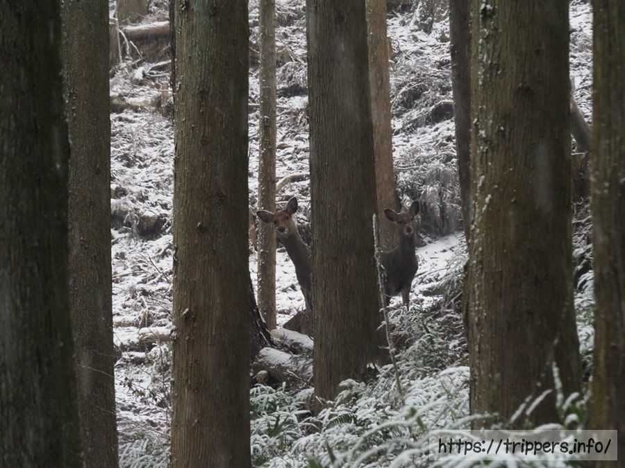 雪は音を吸収するため静寂の時が流れます。そこに何かの足音が聞こえ、ふと遠くを見上げると鹿の群れと見つめ合いになりました。木々の隙間から、ひょっこりはんです。