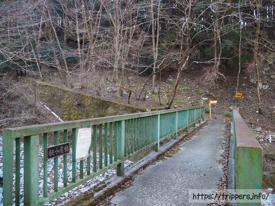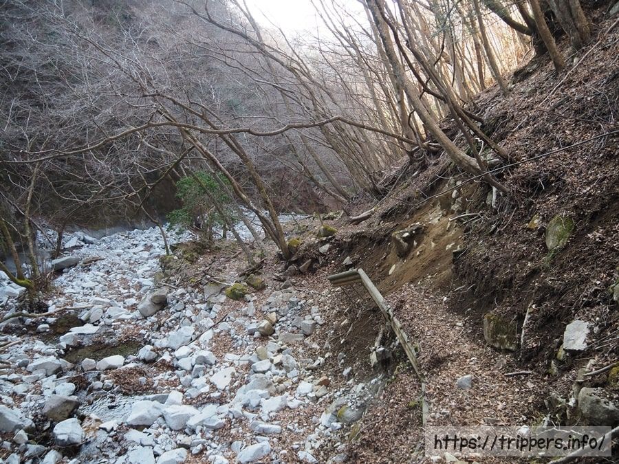 ここの崩落個所は手前で河原に降りるのが正解かもしれませんが、足が短いと段差が高すぎです。表出した鉄の棒に足を載せながら、木の板を手すり代わりにして進みました。