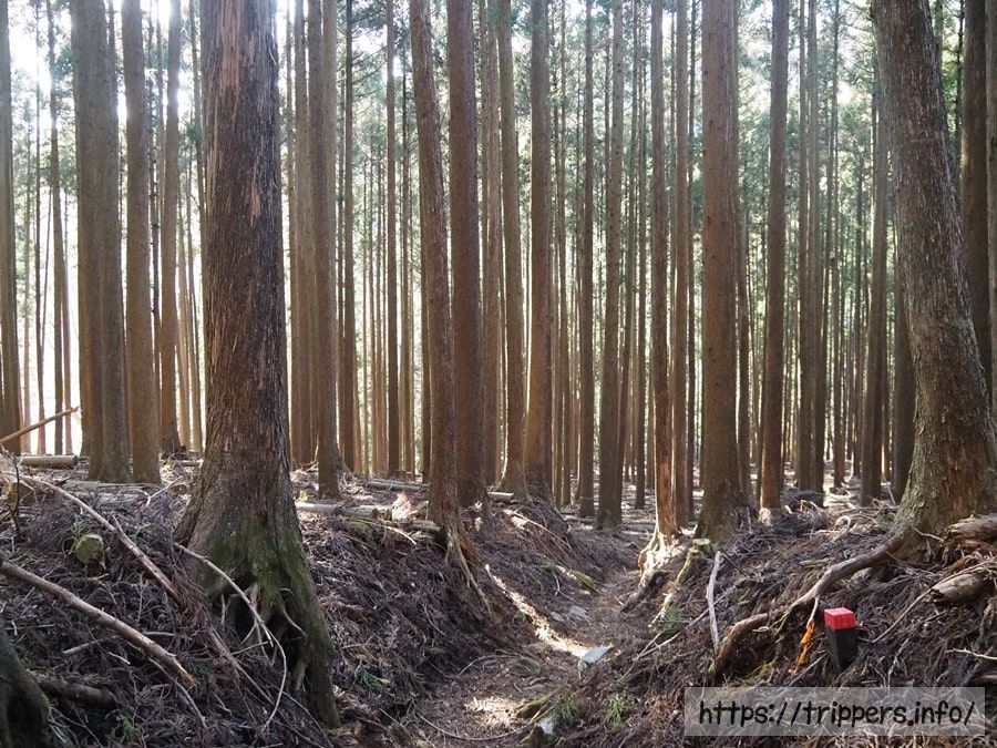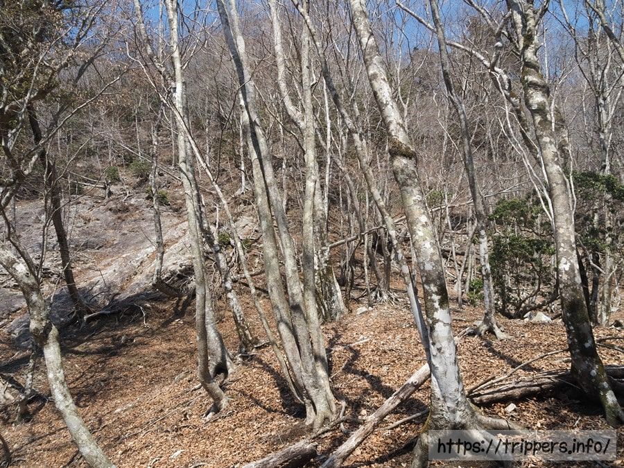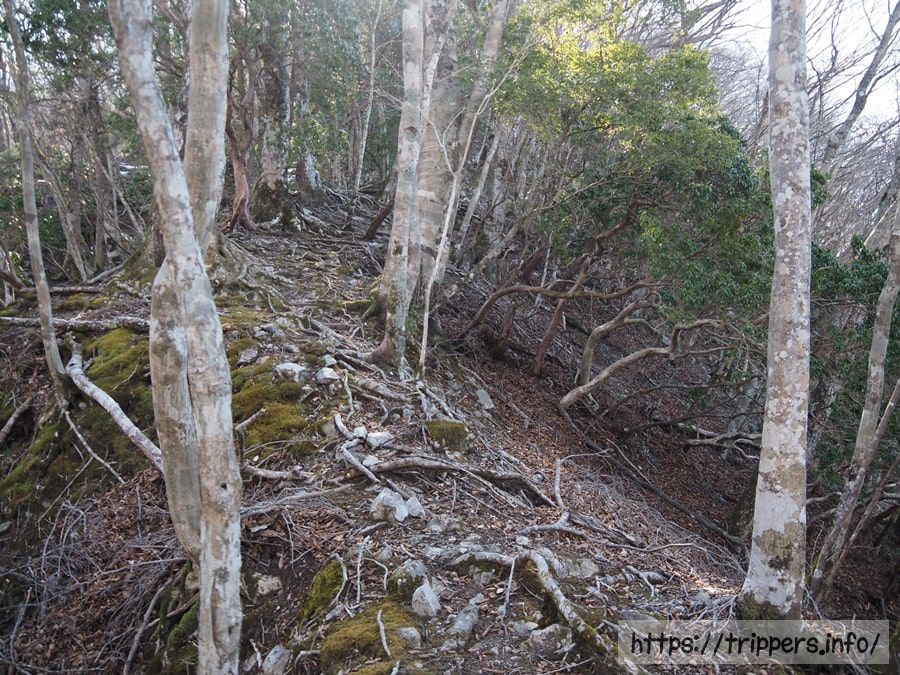檜洞丸や石棚山へ向かう一般登山道を少し歩いたら、すぐに右の方へ道を外れます。他の山域だったら、道を外れて山を踏み荒らすなとか、言われるのかもしれません。同じバスを下車した他の登山者からの視線を気にせずに進みます。本来ならここから急な斜面をまっすぐ登るようです。
