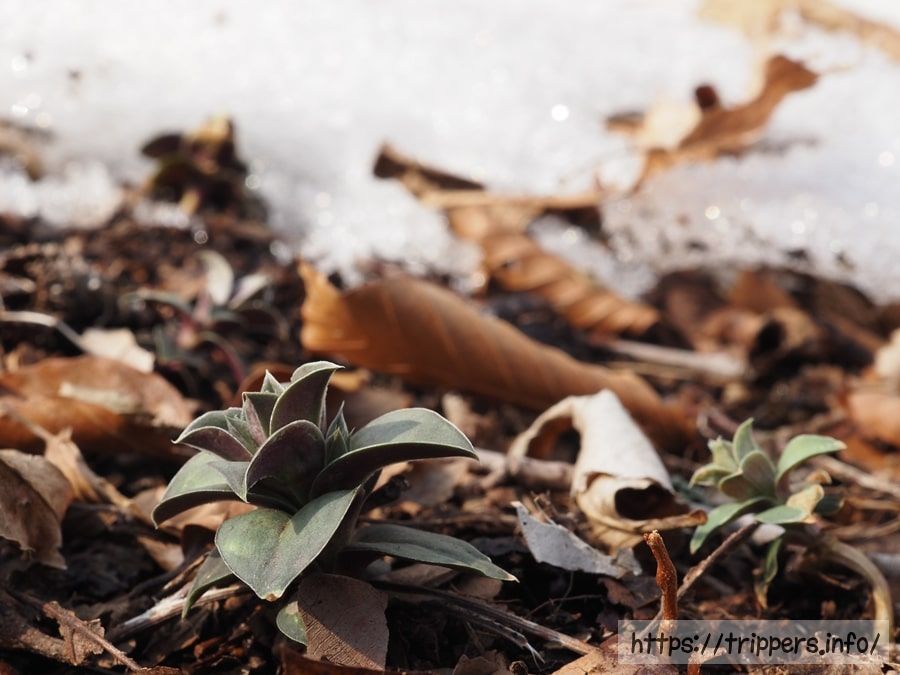 白い花を咲かせるイチヤクソウの葉っぱを見つけました。紫色を帯びる個体は珍しいようです。花が紅色のベニバナイチヤクソウかもしれませんが、咲いてみないと判別できません。