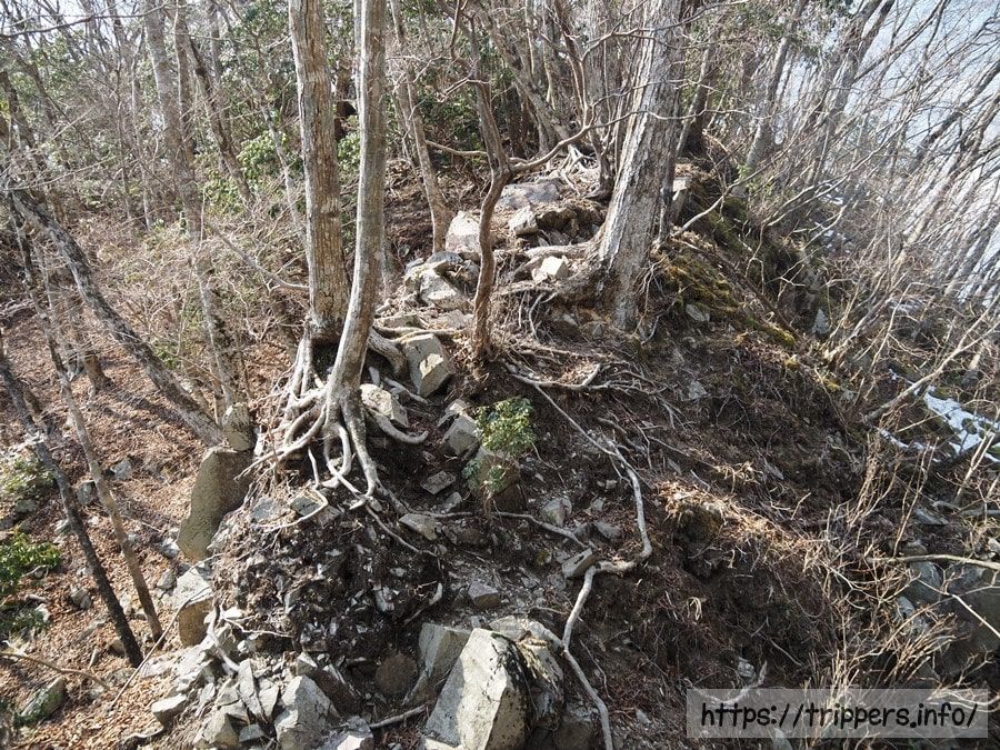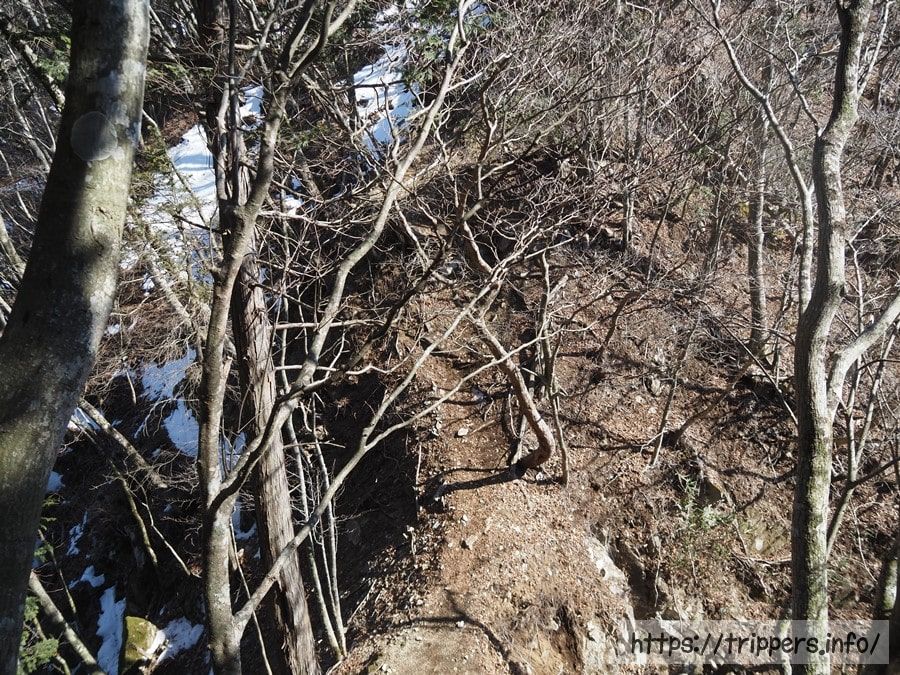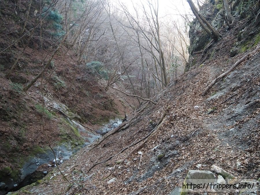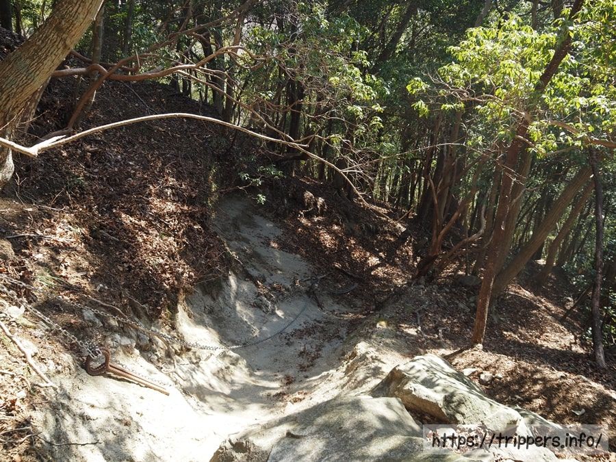 滑り台よりも滑りそうな、このザレた鎖場は、安全な場所から鎖が手に届かなかったため、右側の落ち葉がある場所を通行しました。去年通過した時には、鎖を使ったような、、、曖昧な記憶です。手足や身長が縮んでしまったかもしれません。もともと低身長なので、ぴえん問題です。