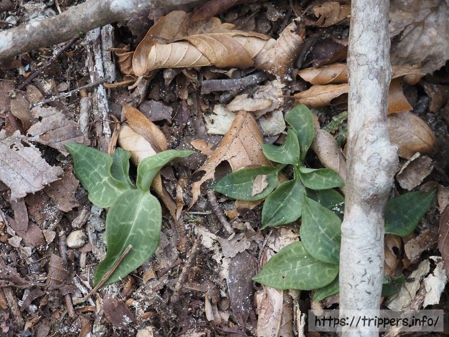 秋になったら縦一列に花を複数咲かせるミヤマウズラの葉です。葉の模様が宝石の輝きのようで、山野草好きに人気があります。こんな辺ぴな場所なら、盗掘や食害の心配は要らないと思います。