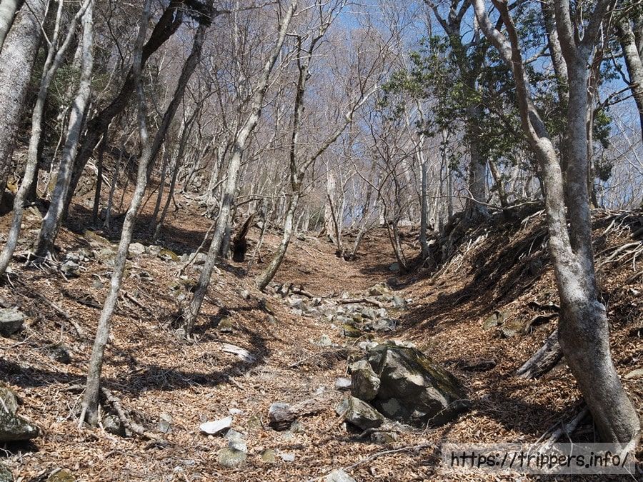痩せ尾根だったり、ザレて滑りやすかったり、勾配があったりする登山道を両手足を全て活用して、ひたすらまっすぐ登っていきます。
