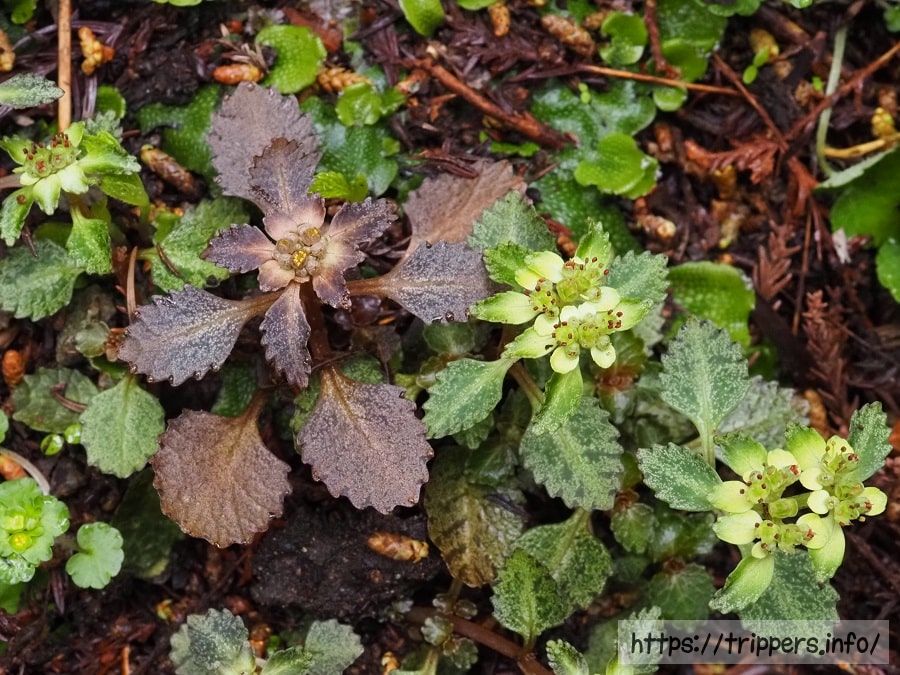 暗褐紫色のイワボタンと緑色のヨゴレネコノメです。先程の個体とは葉の色が逆になっています。どちらも暗褐紫色と緑色の個体がいます。葉の色でどっちの種であるかの判断はできません。色の違いは何が原因なのか、時間経過によって変化があるのか気になる植物です。