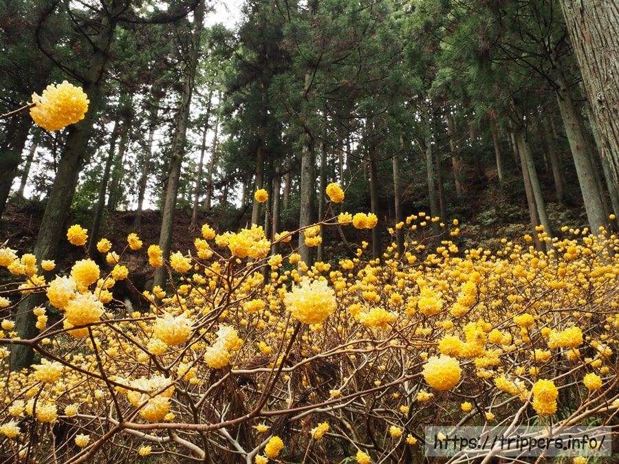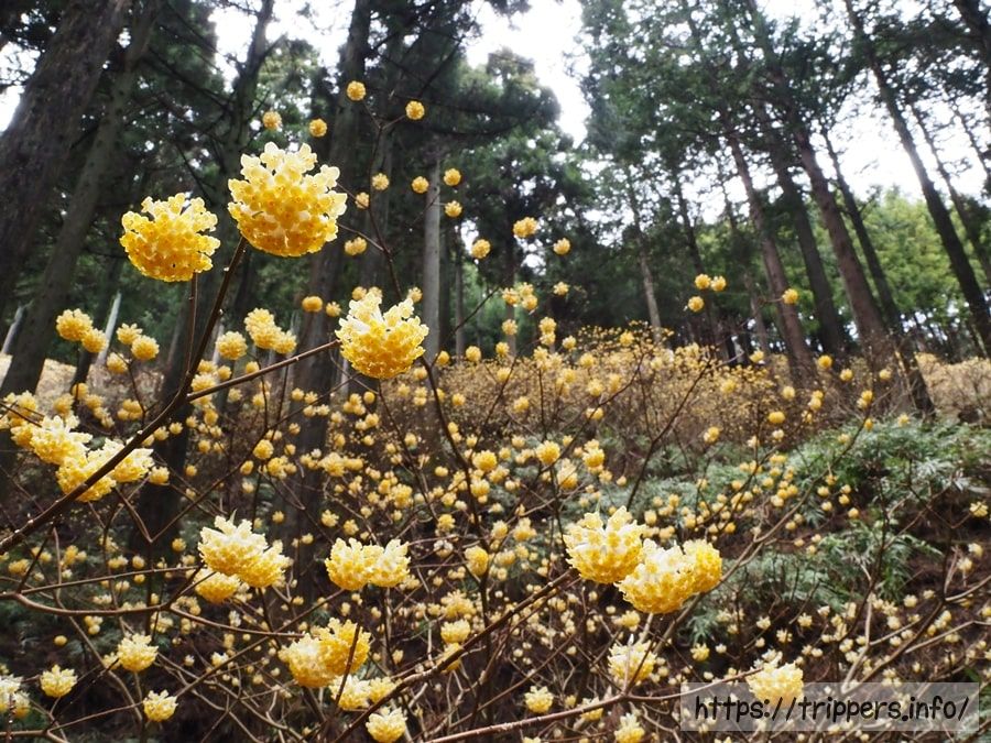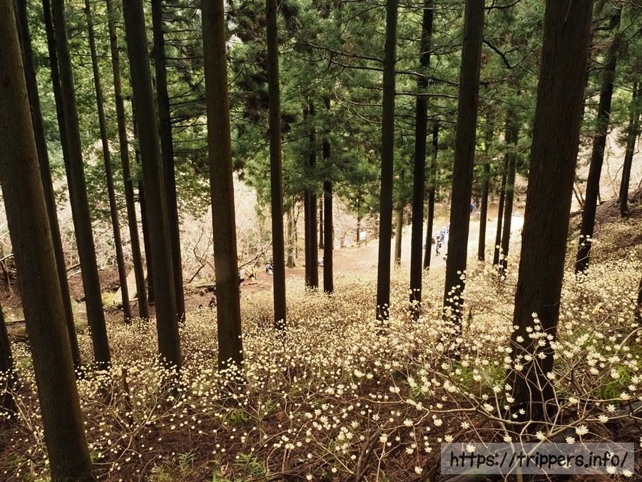 ミツマタの群生地である不動尻に到着です。汚れずに座れそうな場所は既に人で埋まっているくらい、混雑しています。例年だと少し来るのが遅いと思っていたのですが、今年はちょうど見頃でした。終盤になると黄色い色素が抜けて白くなるそうです。