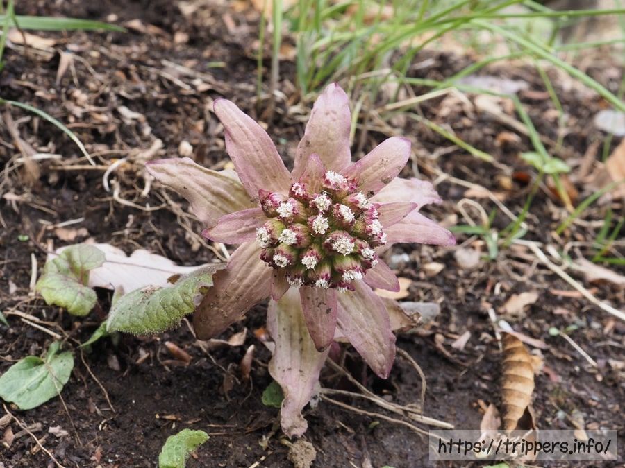 アカフキと呼ばれる紫色のフキノトウです。多量に含まれるアントシアニンが色として表れているのですね。SNSで高尾山の花投稿で見かけやすい植物に思います。道端でよく見るのは緑色です。