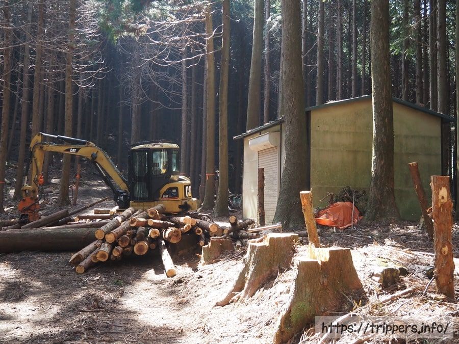プレハブ小屋がある林道終点まで到着しました。所々にネコノメソウ属やキケマン属の植物を見かけました。ここからが登山地図では破線コースになっています。