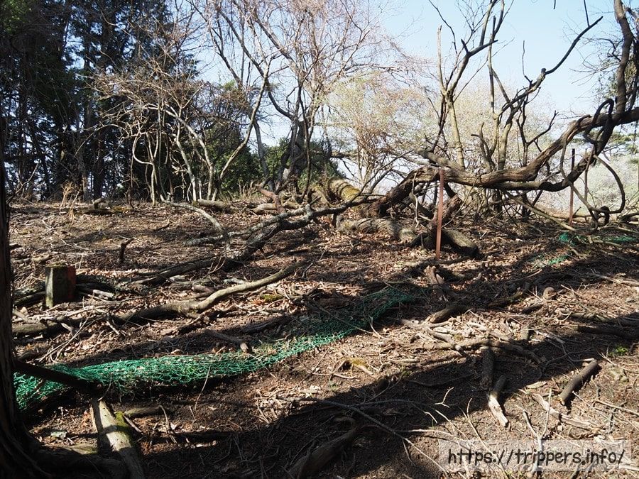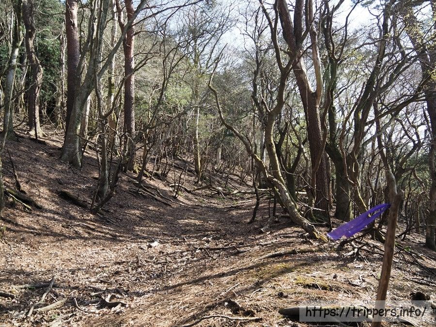 土砂によって自然のアスレチックになっています。高尾山だと、歩いて良い場所が明確に決まっていることが多いように思います。けれどここの山域はどこでも自由に歩けます。その分、道が分かりにくいです。道標はありませんでした。辛うじて誰かが枝に巻き付けたビニールテープが目印ですが、目印がない区間があります。またテープを信じて良いのかの自己責任もあります。