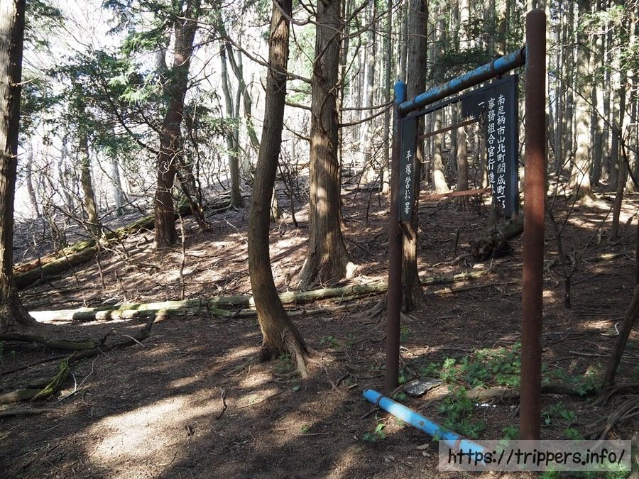 分岐まで戻り、破線にもなっていない真ん中の道(近野山山頂踏破コース)を進むことにしました。ちなみに左の道に進むと洒水の滝の上流部に行け、残る道は山北駅へ続いています。