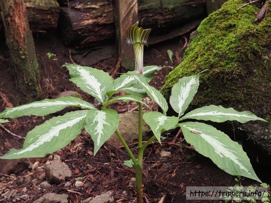斑入りマムシグサです。テンナンショウ属は種類が多くて、個体差も大きく、識別が難しいです。日本には53種のテンナンショウ属が存在します。性転換する雌雄異株です。雄株の仏炎苞は花粉を運ぶ虫が中に入った後、脱出できる穴があります。雌株は穴がないため、受粉するために花粉を運んできた虫を仏炎苞の中に閉じ込めたまま三途の川へ渡らせます。