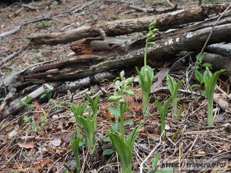 ほぼ全てが蕾で、開花は2~3日後、更に数日後には見頃終了しそうな予感です。ヤマビルを避けて休憩するために、土嚢や丸太の上など、ヒルがいない場所、またはヒルが近寄ってきても気が付ける場所で立ち止まります。
