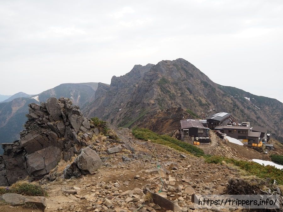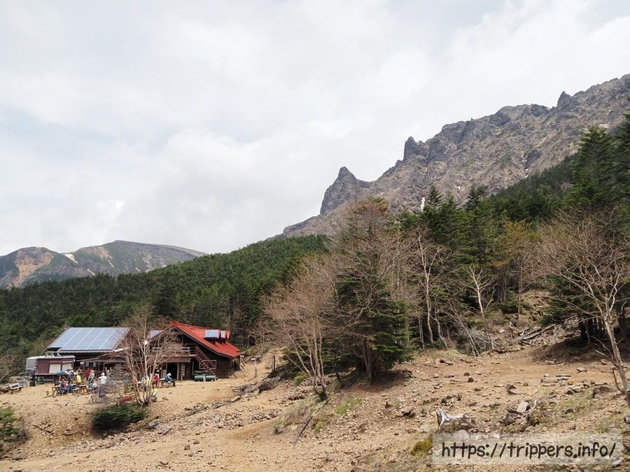 食事を食べる頃には外の景色を隠していたガスが消えていき、次第に晴れていきました。朝食を食べたら、ザックを背負って山小屋を出発します。赤岳天望荘は今年改装をするらしく、今見ている山小屋の姿は見納めになるのでしょうか。建築の関係者が宿泊しており、昨晩の八ヶ岳開山前夜祭を盛り上げるために、大きな野次を飛ばしていたのが印象的でした。