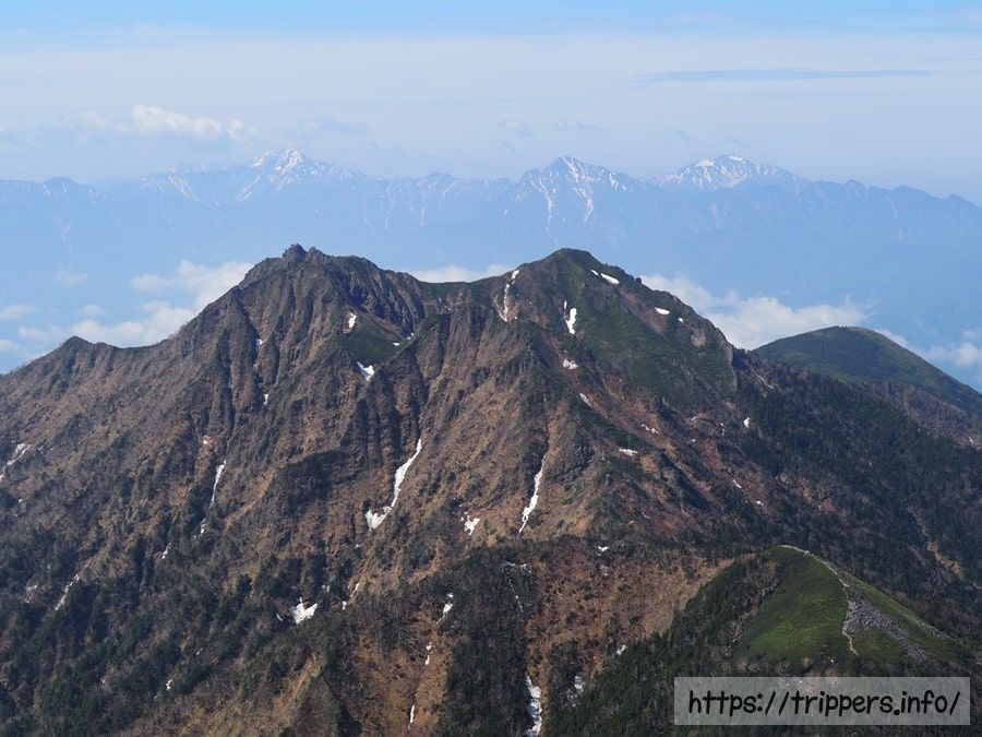 権現岳と編笠山の後ろに左から北岳、甲斐駒ヶ岳、仙丈ヶ岳が見えました。6月末にはキタダケソウが北岳に咲く時期ですが、今年は違う花を見る予定です。