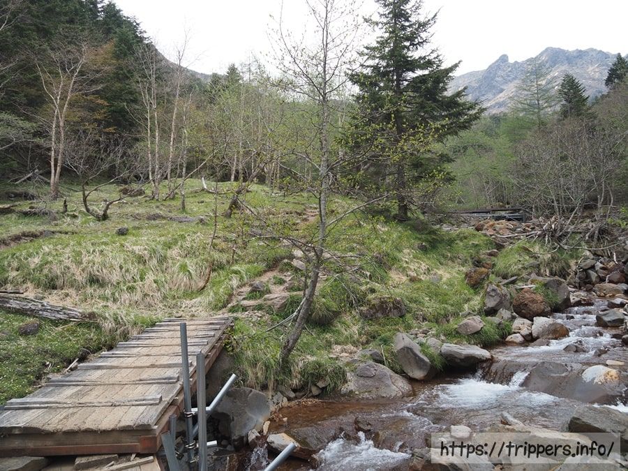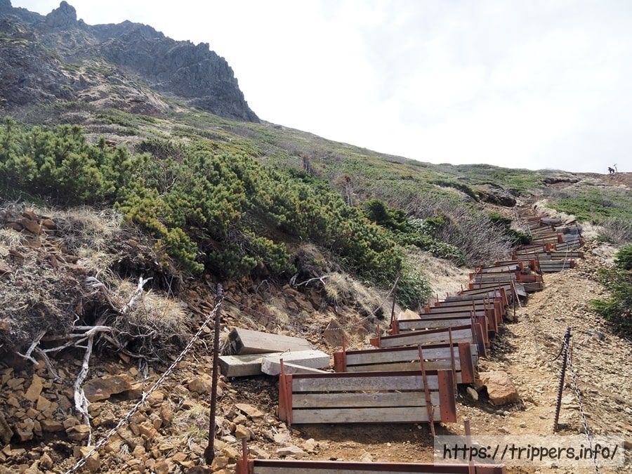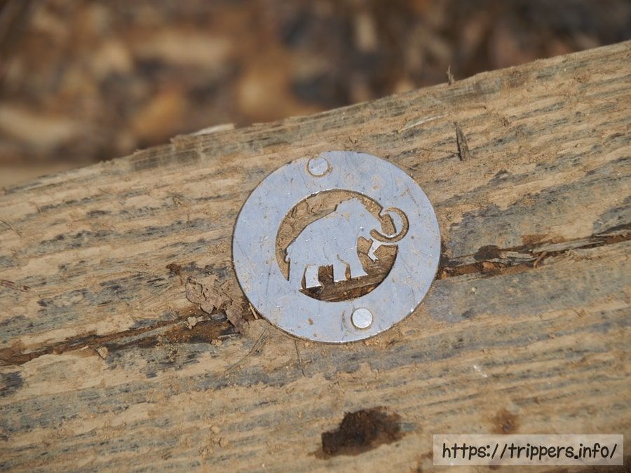 マムート(MAMMUT)のマークが入った木道です。これは登山用品のブランドである会社マムートが登山道整備に協賛して、階段を提供しているからです。文三郎尾根だけでなく、行者小屋と赤岳鉱泉を結ぶ登山道でも見かけました。
