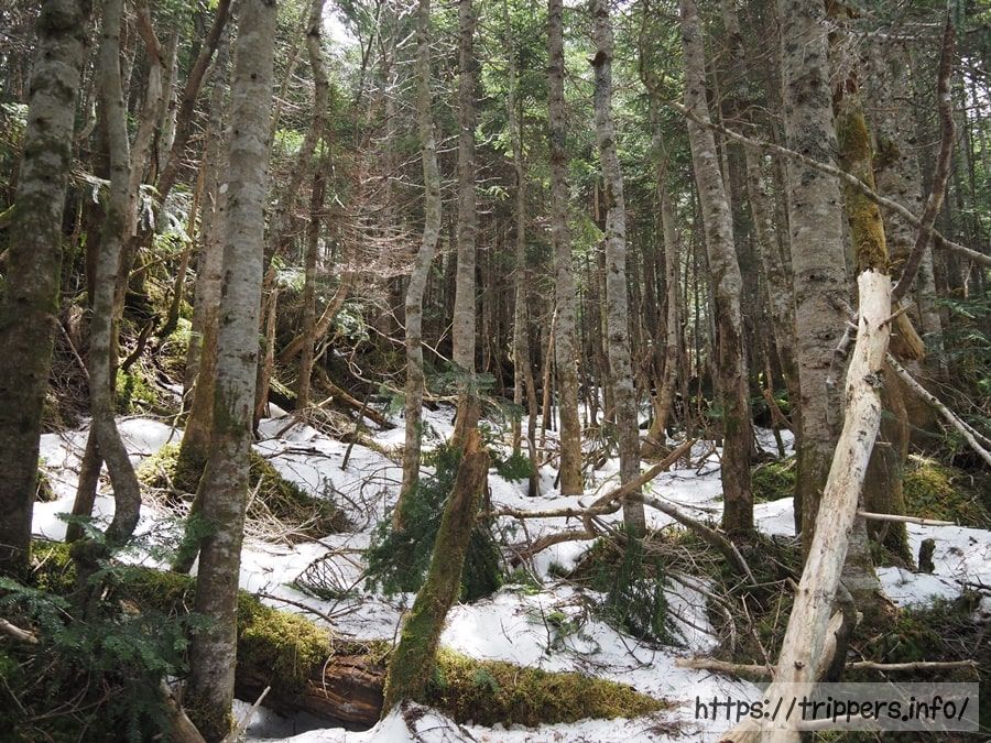 山と自分の目線が同じ高さだったのに、だんだんと山を見上げるようになってきます。標高を急激に下げているので、あっという間に樹林帯へ突入してしまいます。