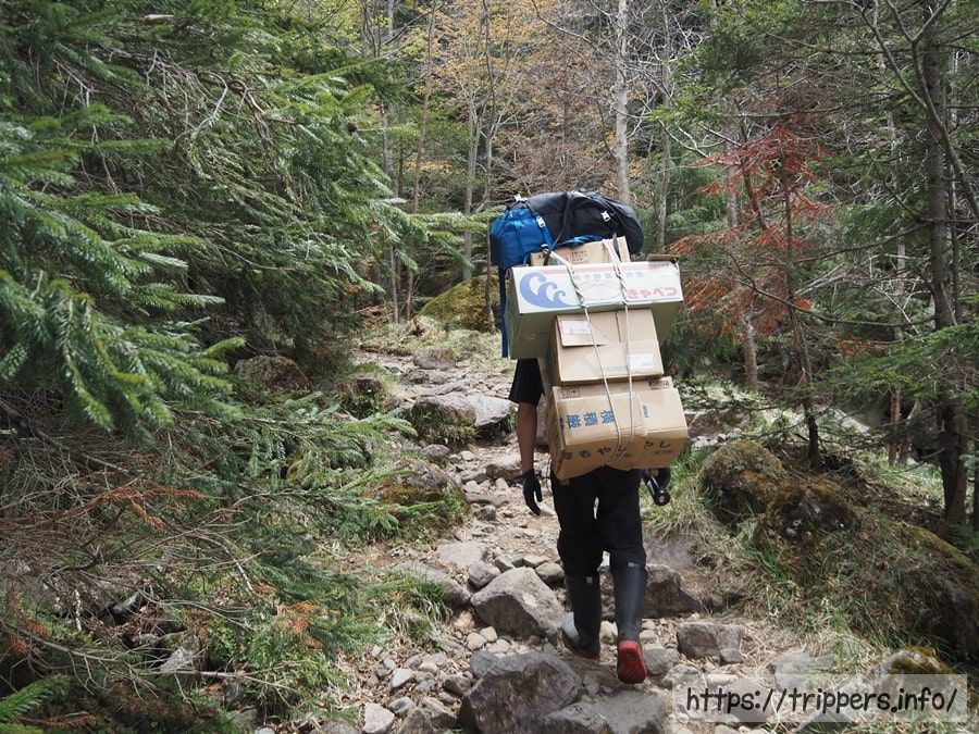 ボッカさんとすれ違いました。八ヶ岳にもいるんですね。靴を見ると、長靴だったので、長靴の万能さを再認識です。丹沢のボッカさんや、長年登り続けている玄人は登山靴よりも長靴を愛用していたりします。尾瀬のボッカさんは、長靴を履いている姿を見かけることが少ないです。
