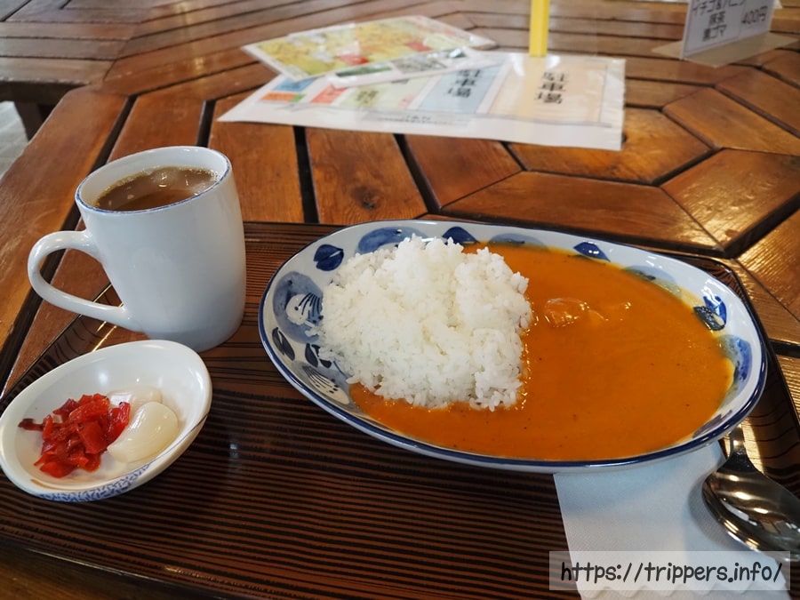 美濃戸口に到着したら、帰りのバスが来るまで八ヶ岳山荘で昼食とお風呂です。赤岳天望荘でもらった無料の入浴券とコーヒー券を使いました。バターチキンカレーは、具がほとんどありませんでしたが、辛さとコクがクセになります。