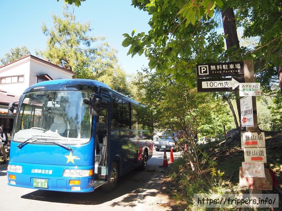 まずは電車で韮崎駅に来たら、バスに乗り換え、1時間ほど乗車して終点のみずがき山荘に到着しました。紅葉の最盛期はまだですが、登山日和だけあって、駐車場は大混雑でした。テント場は予約不要なので、行きたいと思った時に行ける山です。