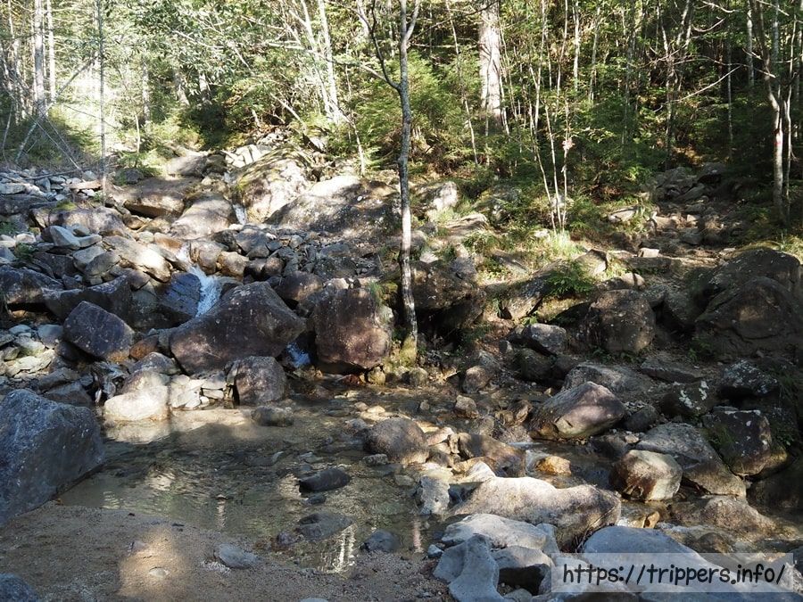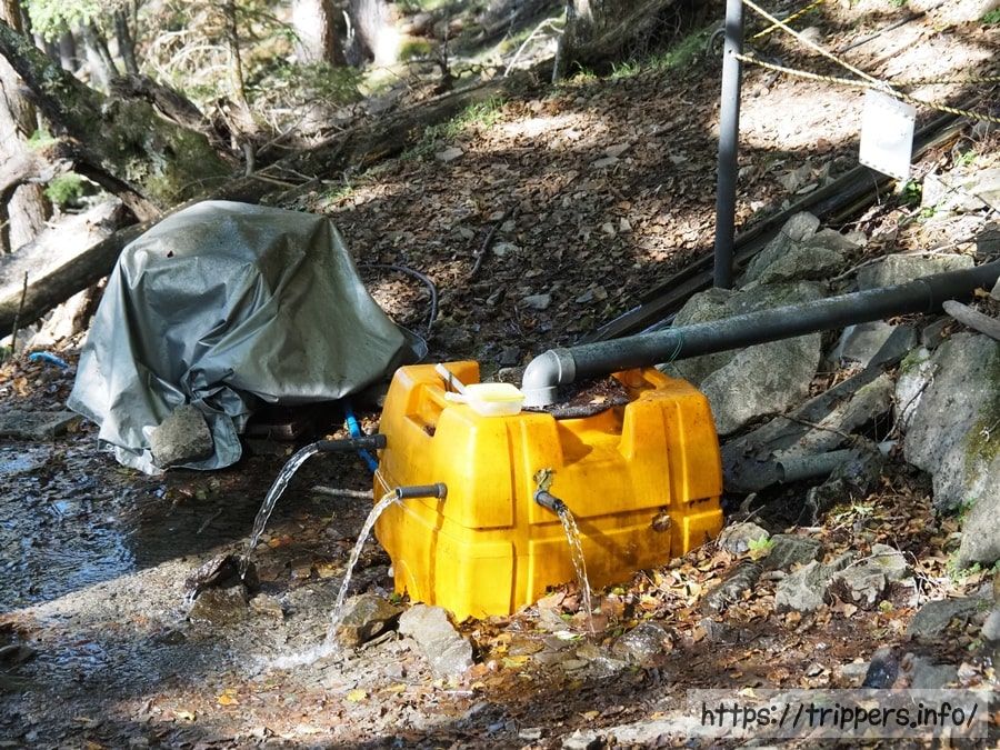 テント場直下にある水場まで来ました。水道水と違って美味しいですが、とにかく冷たいです。お腹が弱い人は一度沸騰させた方が良いと思います。
