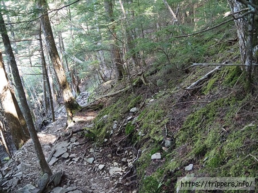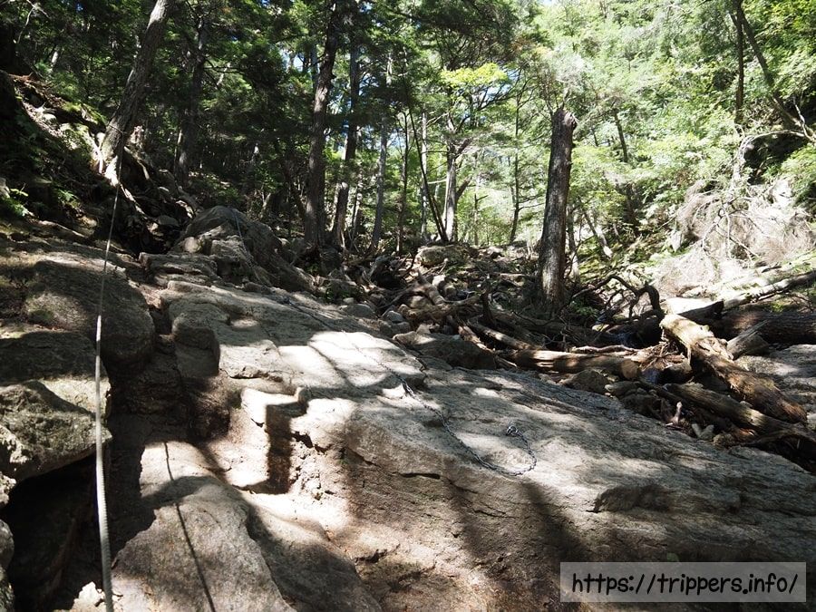 標高を下げ続けたら、天鳥川を渡渉します。ここら辺には元からいるヤマトイワナと放流されたイワナが混在して生息しているようで、登山者だけでなく釣り師にも人気のようです。ちなみにどこでかは不明ですが、団体グループの1人が沢の水を飲んでお腹を壊し、翌日の金峰山登頂を1人だけ諦めたようです。