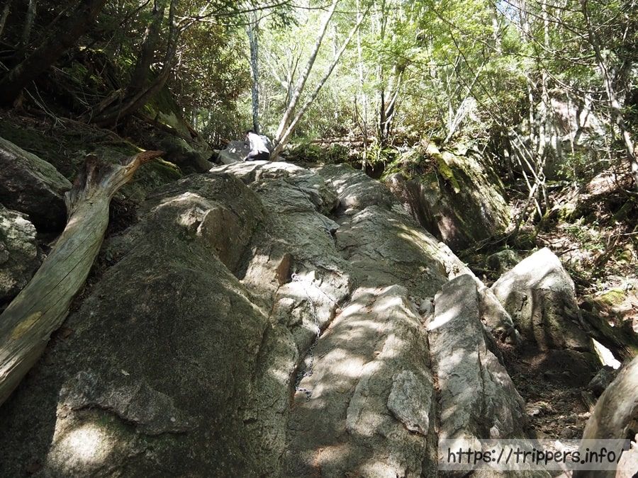 ここも同様な岩と鎖です。テント場から山頂までは標準タイムが2時間で、登りの累積標高は550mあります。重たい荷物はすべてテントに置いてきて、軽いサブザックで登っているので、ハイキング感覚で登れます。