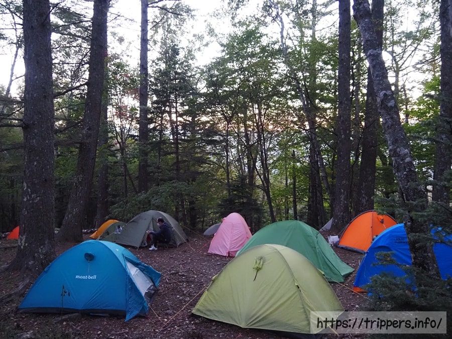 へたくそなテント組み立てのせいで、見栄えは悪いですが、一応寝床は完成しました。ここが初めてのテント泊におすすめの理由は、稜線ではなく、樹林帯なので風がないことです。フライシートをシワなく張れなくても、ペグ打ちが甘くても問題ありません。強風でテントが飛ばされることも、フライシートが強風で大きな音を立て、不眠になることもありません。イノシシが夜中にテント場を猛スピードで通過することはあります。