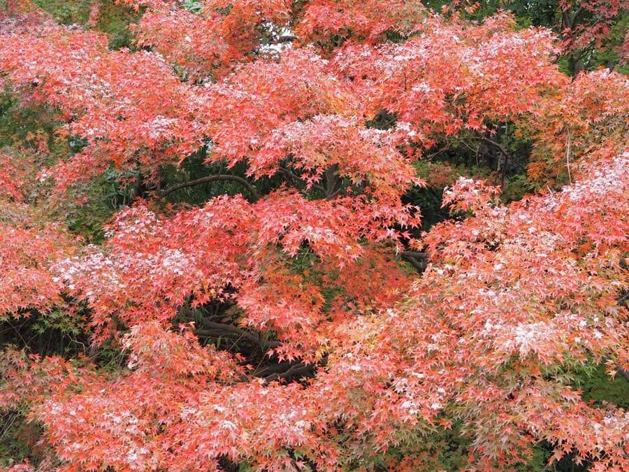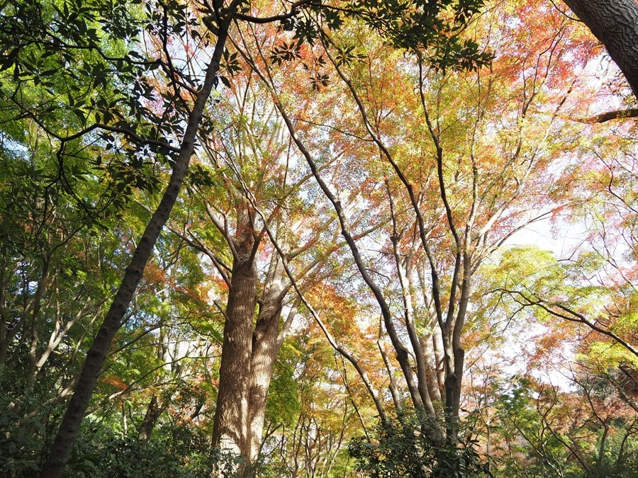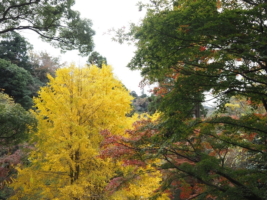 鎌倉アルプス(天園ハイキングコース)は六国見山森林公園が端の入り口になっていますが、今回は建長寺の奥にある鎌倉二十四地蔵霊場・第十一番札所から入ります。イチョウの黄葉がピークです。鎌倉は京都など他の紅葉の名所と比べて、規模は大きくありません。けれど鎌倉は紅葉スポットが多く、日当たりの良さや標高差などで、紅葉の見頃の時期は寺や場所ごとに差があります。