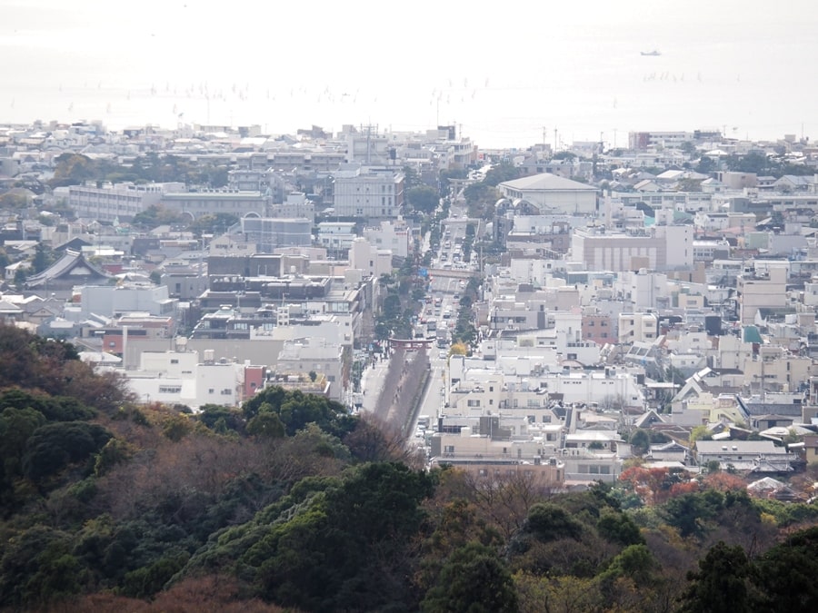 少し歩いた別の場所では、湘南の海がある由比ヶ浜から鶴岡八幡宮に通じる参道の、若宮大路を見下ろせました。参道に人混みが少ないように感じたのは、昼食の時間なので食事処に人が流れているのか、または小町通り人が集まっていそうです。