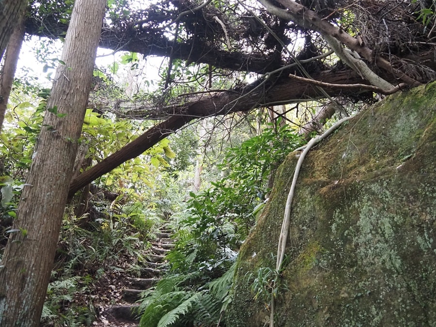 平成巡礼道から登山道を進みます。景色は様変わりして、どこかのジャングルのようです。なのに肌寒いです。