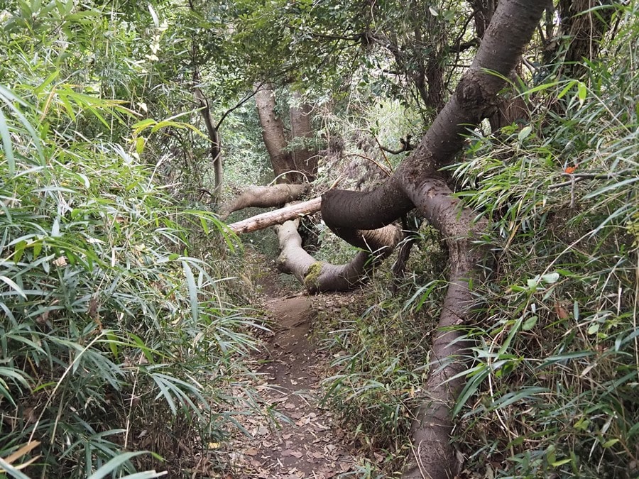 岩を削って作られたようなトレイルコースに苔が付き、木の根が張り出し、古道っぽさを感じさせます。そんな雰囲気が鎌倉アルプスの特徴だと思います。鎌倉の各寺院の境内にも削られた岩や苔、根が多く、町全体が統一された世界観です。