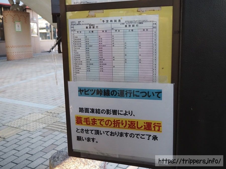 既に雪に付けられた足跡は1人分で、往復した様子はありません。キュウハ沢出合まで降りて行ったのかもしれません。そこまで歩いてみたいですが、そこからバス停がある場所まで歩き終える前に日が暮れそうです。車があれば、塩水橋に車を停めて、天王寺尾根を使って周回歩きが出来るので、公共交通機関の不便さを痛感してしまいます。