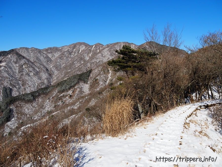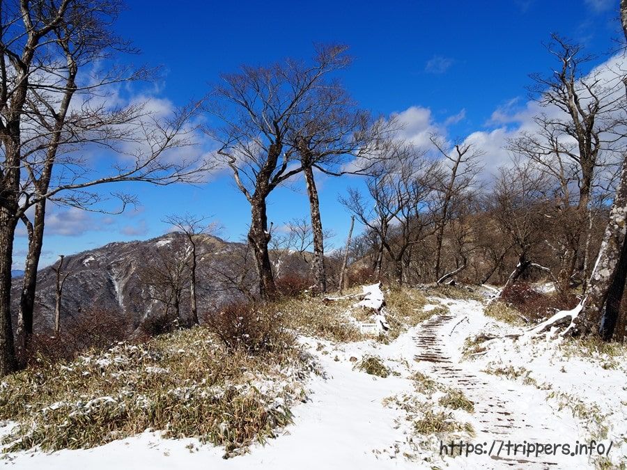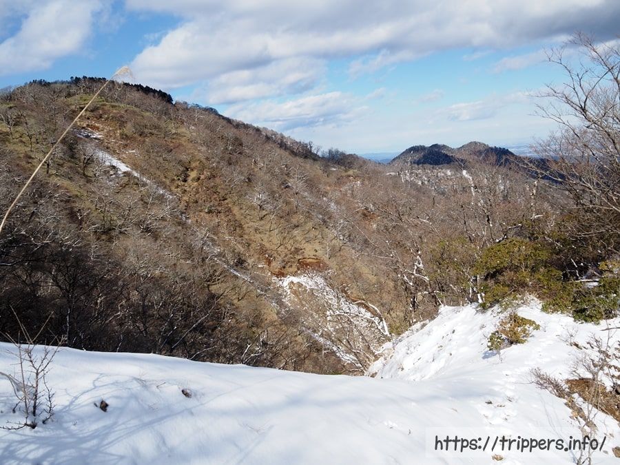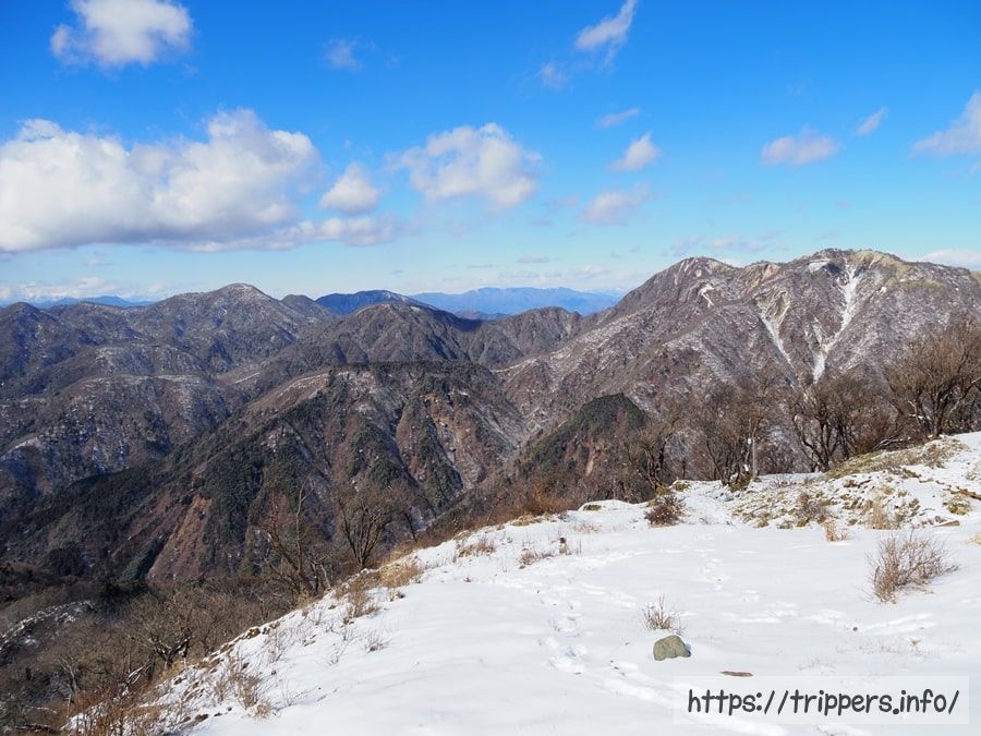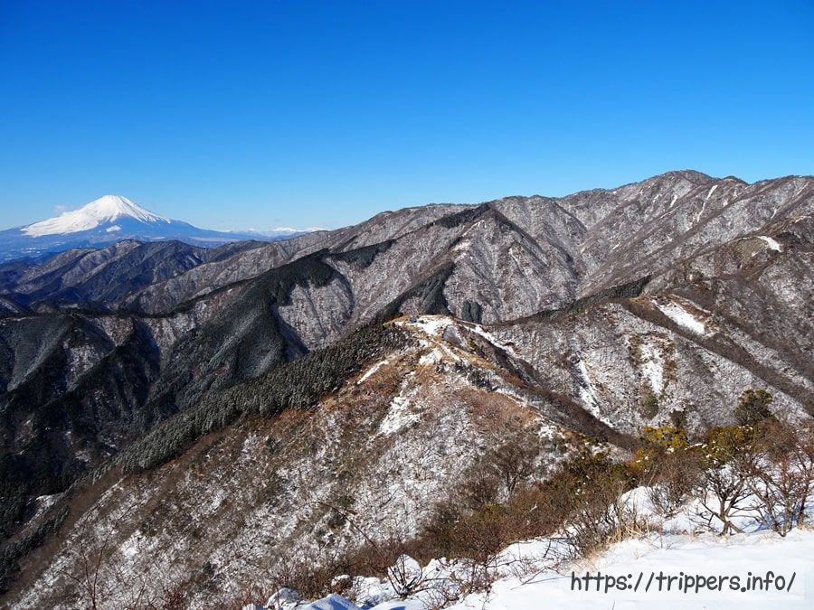 展望もあり、表尾根を間近で見ることができます。日光が当たらない斜面のためか、表尾根の山肌に雪が多く残っています。また三角沢ノ頭(寿岳)の斜面は真っ白で、足跡は皆無でした。好きな丹沢の山頂ランキングで、上位に来そうな場所です。私の中では上位です。
