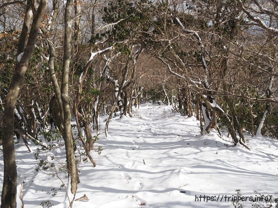 木々の隙間からこぼれる陽の光はとても印象深かった雪の道です。自分の性格を考えると、寝坊しなくても、ひたすら急いで進んでいたと思います。植物がある時期だと、山野草が自生していないか左右上下を見まわし、凄く遅いペースになってしまいます。