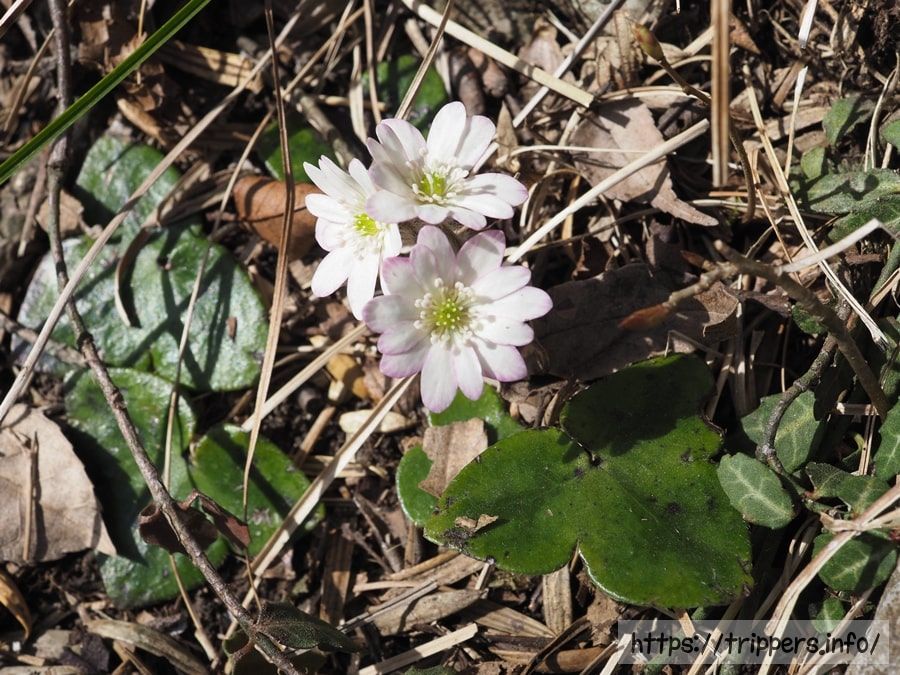 葉の先端が丸いスハマソウを見つけました。丹沢で見かけたミスミソウは、葉の先がもっと尖っていたので、スハマソウの認識で良いと思います。藤原岳周辺には、両方存在するため、両方の特徴を持った中間型など、ミスミソウなのかスハマソウなのか分からない個体もありそうです。