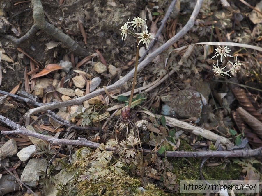セリバオウレンを見つけました。今まで見てきたセリバオウレンは、葉も背丈も大きかったのですが、ここで見かけるのは、どれも小さい個体ばかりです。小さいからコセリバオウレンなのかと思いきや、葉は2回3出複葉であるため、確実にセリバオウレンです。大きさで同定は出来ないのだと知りました。ちなみに、この後も葉が3回3出複葉であるコセリバオウレンを探しましたが、分かりませんでした。ただ、コセリバも存在はするらしいです。