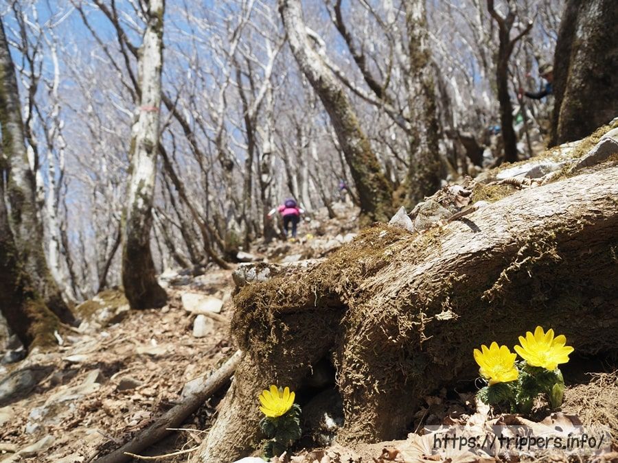 人の叫び声が遠くから聞こえてきました。藤原岳から下山してきた登山者から、この先の急斜面で落石が多く、先ほども発生したようです。そこはフクジュソウとセツブンソウの群生地になっていました。足場が悪いため、花の撮影に夢中になっていたり、不注意に歩くことで人為的な落石がありました。自分が撮影している時も、「ラクー」の声と共に、目の前1mほど先で大きな石が転がっていきました。