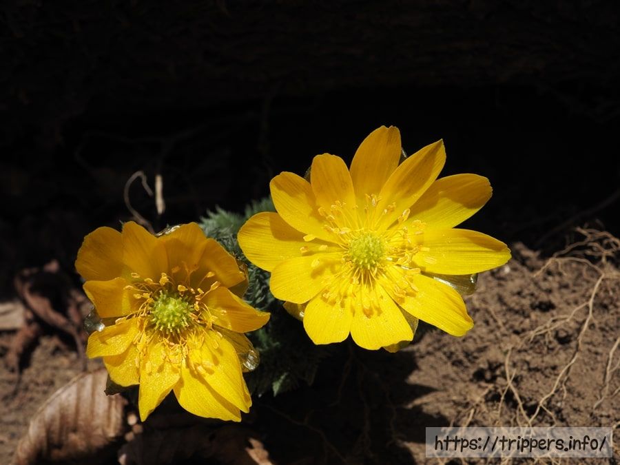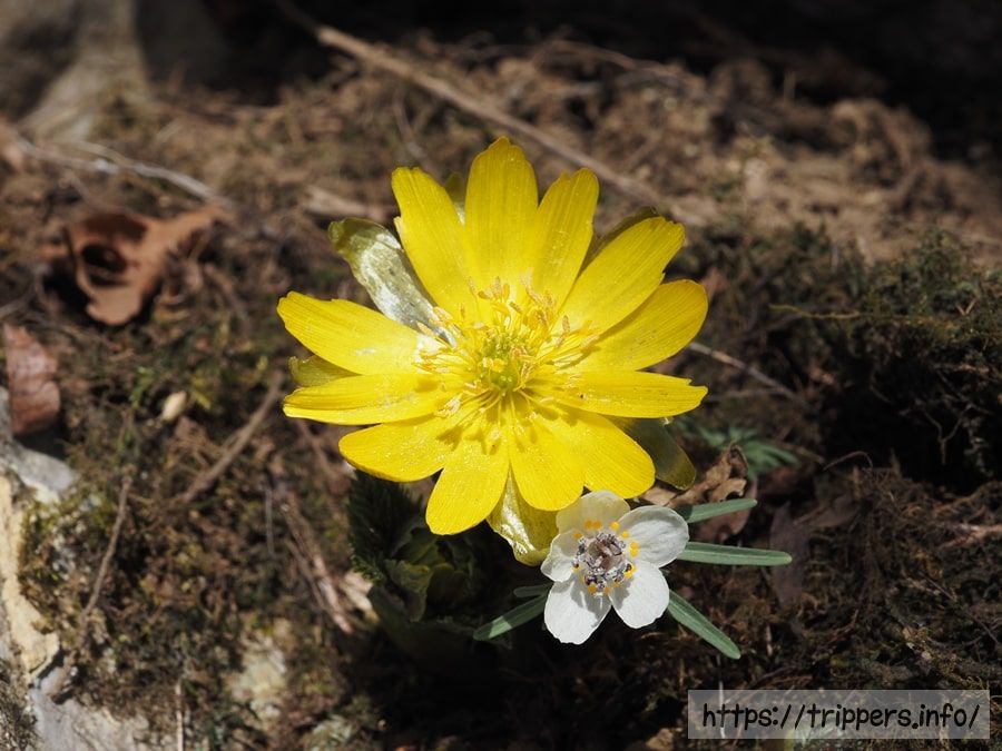 フクジュソウとセツブンソウが一緒に咲いているなんて、しかも植栽ではないなんて、見れて良かったです。どちらも毒があるので、春の山菜天ぷらには出来ません。