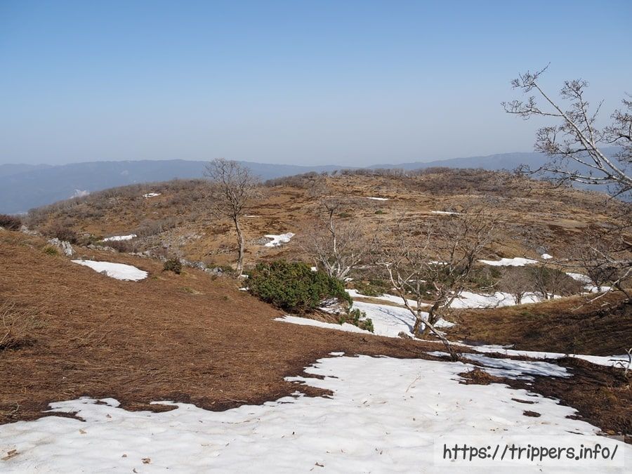 平坦な山頂部に到着しました。雪が点在していると、白い池塘みたいな感じです。
