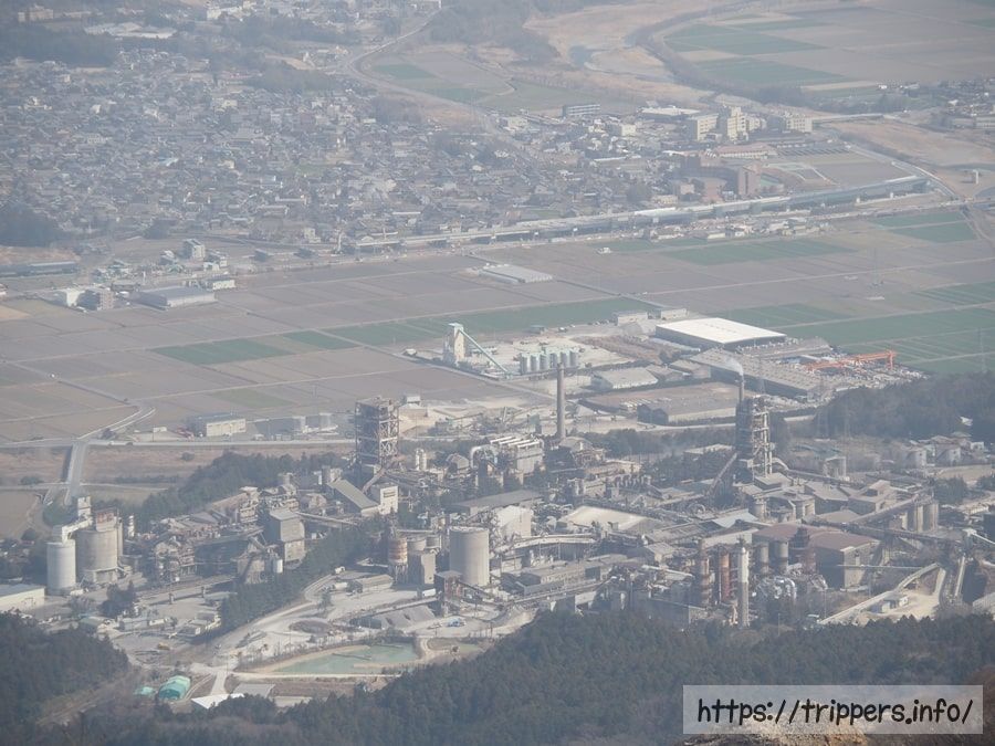 太平洋セメント藤原工場が眼下に見えてきました。藤原岳で採掘したら、その場で工場に運べるわけですね。