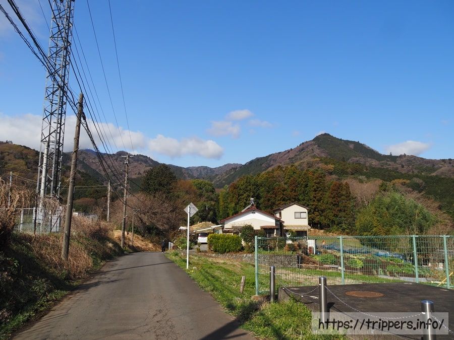 今回の一番の目的は、黄色い葯のハナネコノメを見ることと、知る人ぞ知るマイナーな山頂であるエボシ山を初踏破することです。まずは伊勢原駅からバスに乗り、広沢寺温泉入口バス停で下車しました。不動尻への道を歩いていると、山の頂きが見えてきました。右側の山が鐘ヶ嶽、左側の雲がかかった山が大山です。