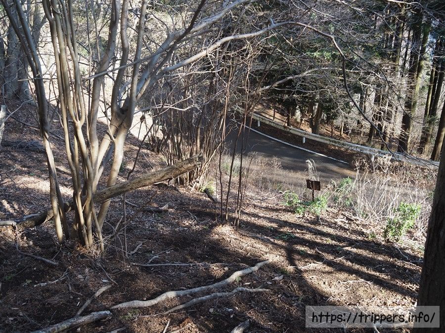 幾度も折り返す登山道は存在しましたが、道を無視して真っすぐ下っていきます。そうすると車道が見えてきました。ここまでは難易度のないルートでしたが、この先は道が不明瞭だったり急登だったりします。車道を右に向かって歩いていけば大山ケーブル駅へたどり着けるようです。