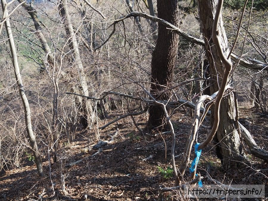 ビニールテープがあったりなかったり。明確な踏み跡はありませんでした。尾根が分岐する場所では、左の尾根を下りたいのに、右の尾根への道しか分からず、右の尾根へ少し降りてから、左の尾根へトラバースしました。登りで使う分には、尾根間違いによる迷子はないですが、下りはどの尾根なら下界まで降りられるのか不明です。そのまま右の尾根を進んだら、無事に下山できたのか分かりません。