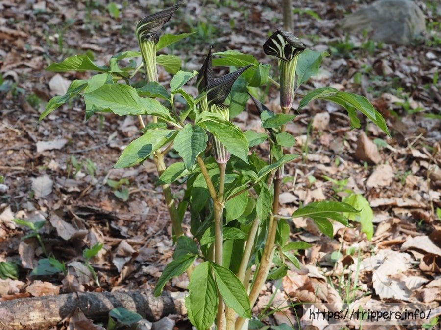 ムラサキマムシグサを発見しました。マムシグサは沢山見かけましたが、どれも緑花でした。ここだけなぜかムラサキです。どちらかというと黒い花でした。